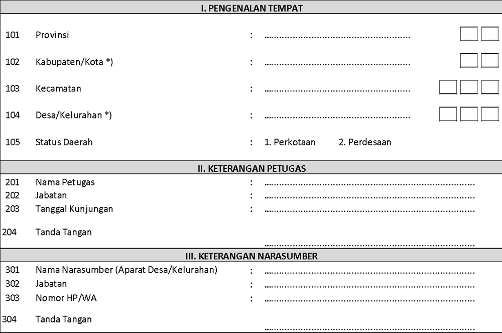 R101-104: Isikan nama dan kode provinsi, kabupaten/kota, kecamatan, desa/kelurahan pada tempat yang telah disediakan