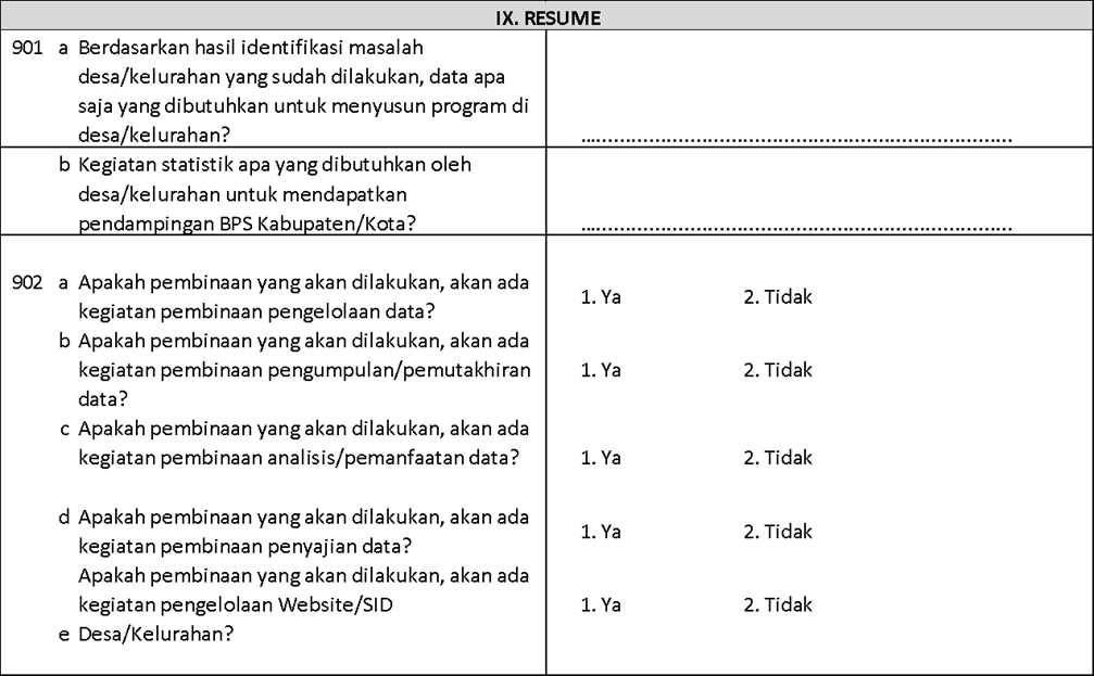 Blok ini berisi ringkasan dari hasil identifikasi kondisi desa/kelurahan yang sudah ditanyakan dari Blok IV sampai dengan Blok VIII.