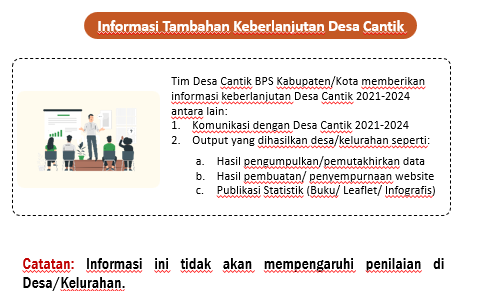 Program Desa Cantik selaras dengan Misi BPS ke-2, yaitu “Membina K/L/D/I melalui Sistem Statistik Nasional yang berkesinambungan”. Tujuan Infromasi tambahan: mengetahui keberlanjutan Desa Cantik yang selama ini telah di bina.